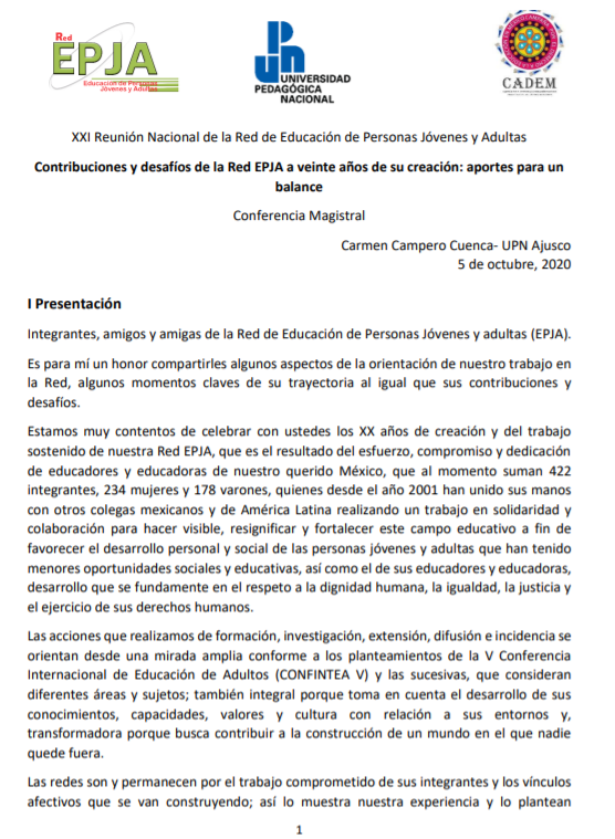 Conferencia Magistral «Contribuciones y desafíos de la Red EPJA a veinte años de su creación: aportes para un balance»